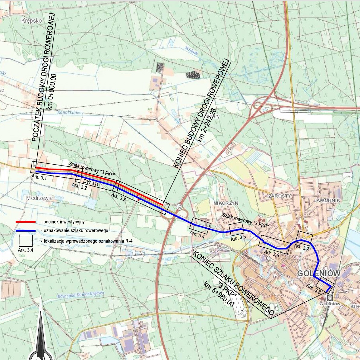 Początek budowy nowego łącznika, znajduje się w miejscowości Modrzewie w gminie Goleniów. Stąd nowa trasa rowerowa, poprowadzona zostanie w kierunku węzła drogi S3 z drogą wojewódzką nr 111, po jej północnej stronie. Droga rowerowa będzie tu miała szerokości 2,5m i nawierzchnię bitumiczną. Odcinek będzie miał długość 2,24 km. Dodatkowo w ramach tego zadania zostanie oznakowane 3,74 km trasy.