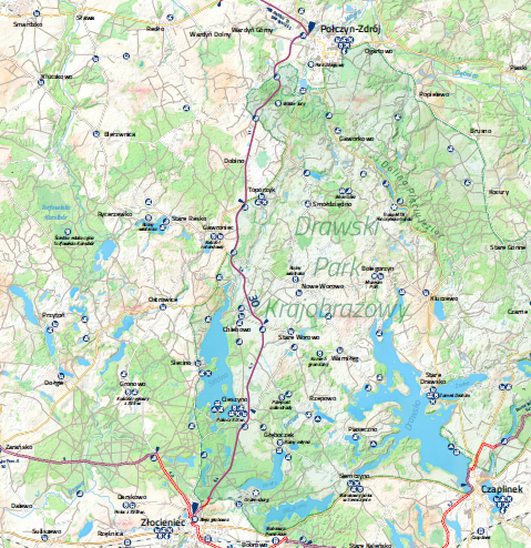 W Złocieńcu Stary Kolejowy Szlak krzyżuje się z Trasą Pojezierzy Zachodnich, wiodącą ze wschodu na zachód, południową częścią województwa zachodniopomorskiego. Od Wierzchowa do Wałcza i granicy województw, trasa będzie biegła znów po śladzie dawnej linii kolejowej.